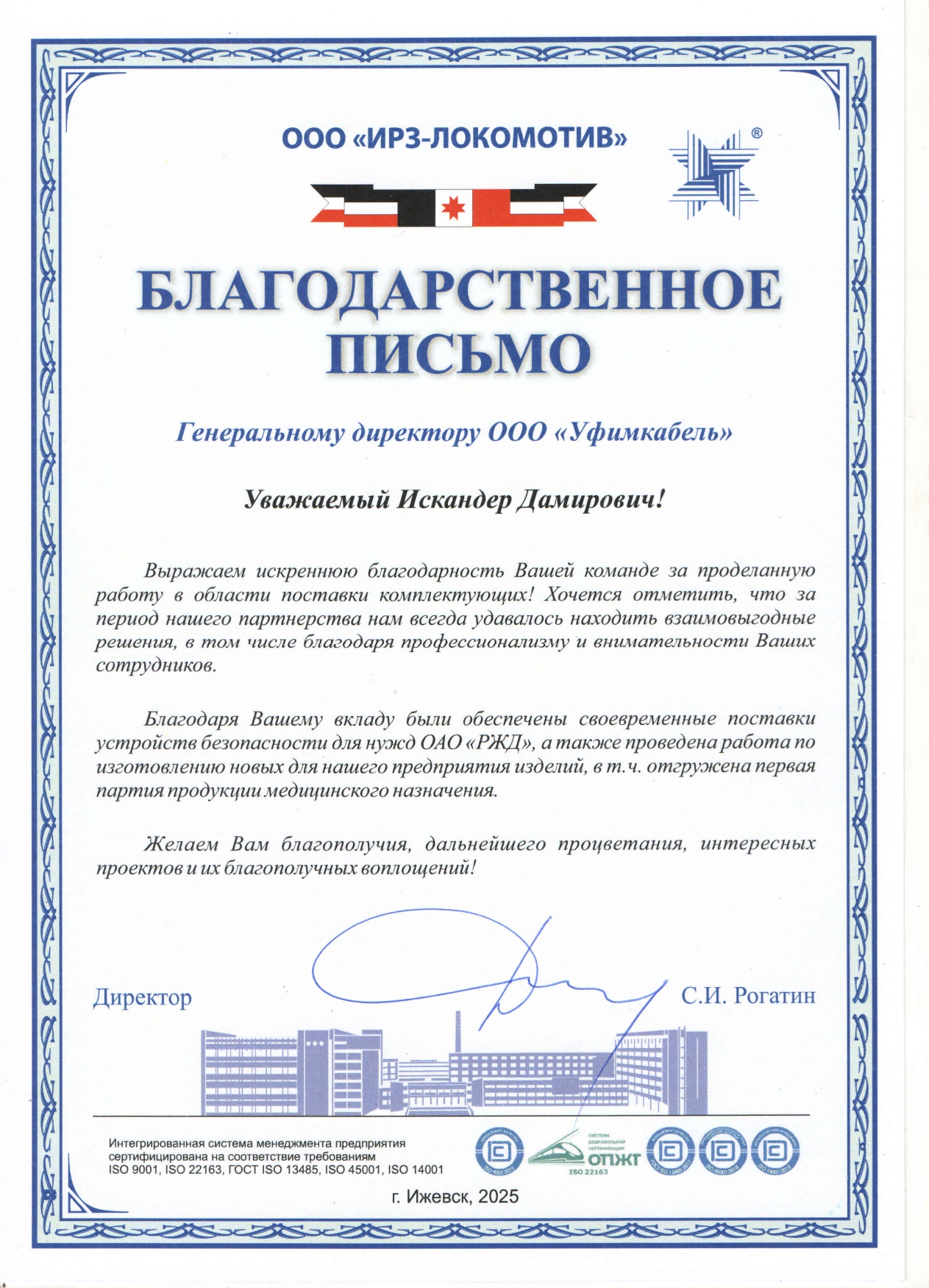 Благодарственное письмо ООО "ИРЗ-ЛОКОМОТИВ"